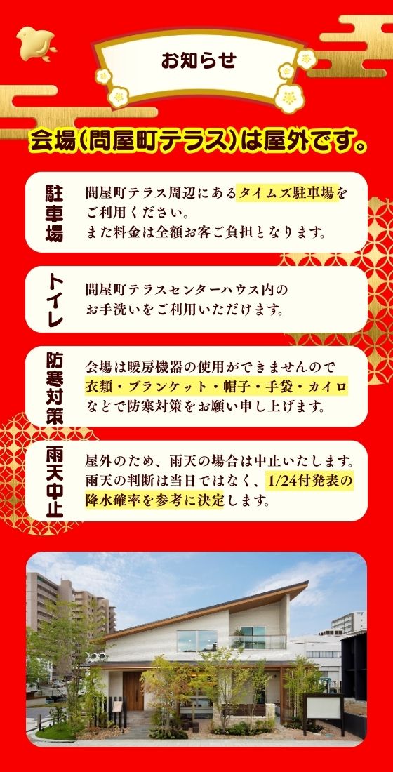 会場は暖房機器を使用できませんので、衣類・ブランケット・帽子・手袋・カイロなどで防寒対策をお願いします。