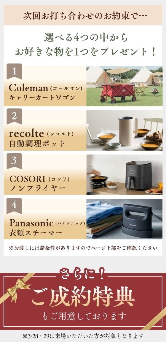 3月28日・29日の2日間限定! 事前WEB予約&初来場の方に!! \ 素敵なプレゼントをご用意 /