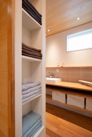 サニタリールームを兼ねる洗面所は、洗濯物を畳んだりアイロンがけが楽にできるカウンターを造作しています。また造作の収納スペースや棚がたくさんあり、細かく整理整頓ができます。角には、家族それぞれ専用の棚を設け、自分のタオルとってお風呂や洗面に持っていけるので、子どもの自立心が自然と身に付きます。