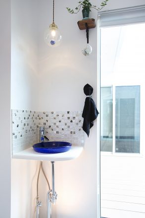 玄関入ってすぐの手洗いコーナー。ブルーのボウルとホワイトのコントラストが新鮮。壁面のタイルは、お施主様ご自身が探されたもの。ディテールまでこだわりにこだわった清潔感溢れる空間となりました。