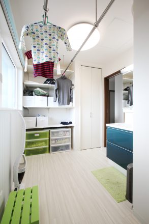 浴室の洗面脱衣所は花粉症対策の部屋干しランドリールームを兼ねた、機能的な空間。洗濯物も日差しで夜には乾いているとか。