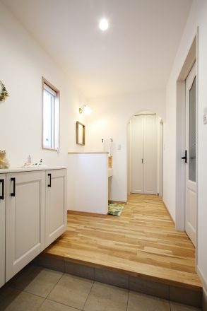 玄関には手洗いコーナーを設置しました。帰ってきたらすぐ手洗いできる、お子様のしつけにもつながる大事な空間。