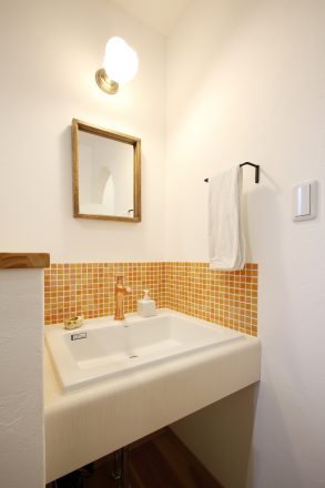 手洗いコーナーは、お気に入りのタイルを貼って、明るく清潔感が溢れています。