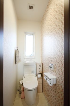 トイレは、女性らしい可愛らしいクロスで仕上げました。クロスの貼り分けが特にお気に入りの奥様。