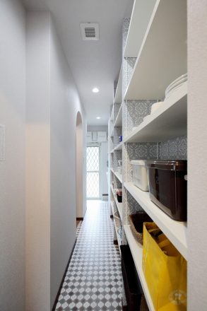 収納力抜群のパントリー。1Fで使う隠したいものは全て納められます。壁面もフック等でくまなく利用できるように下地を入れてあります