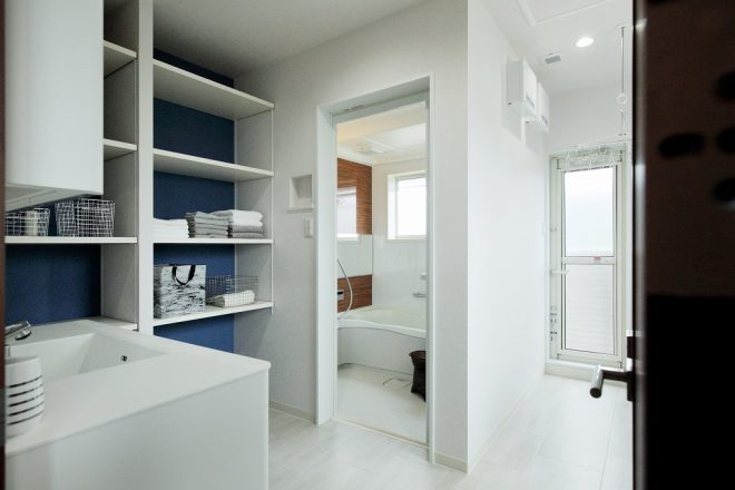 洗面・脱衣室・ランドリーコーナーをひとつのスペースに。アクセントカラーは深いブルー。