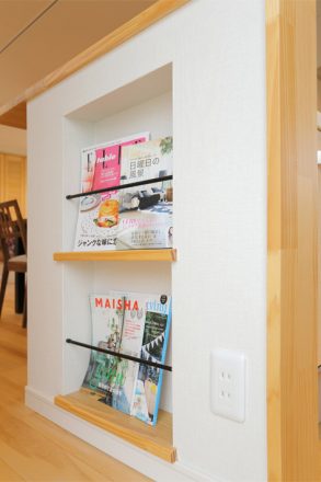 キッチン側面の壁にはマガジンラックを造作した。散らばりやすい雑誌や新聞をお洒落に収納。