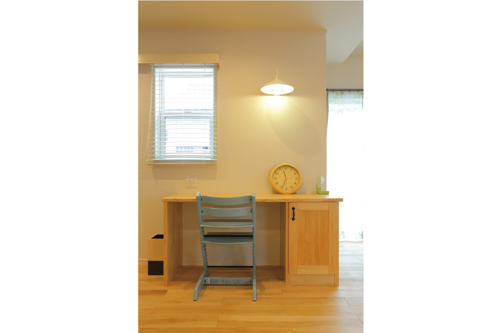 リビングの窓辺に造作したカウンター。パソコンや書き物等をする際に役立つ。