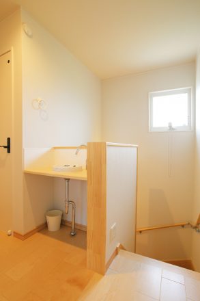 階段には、手洗い器をつけました。わざわざ階下に降りなくても、手が洗えたり、冬場は加湿器の水分補充がすぐにできます。