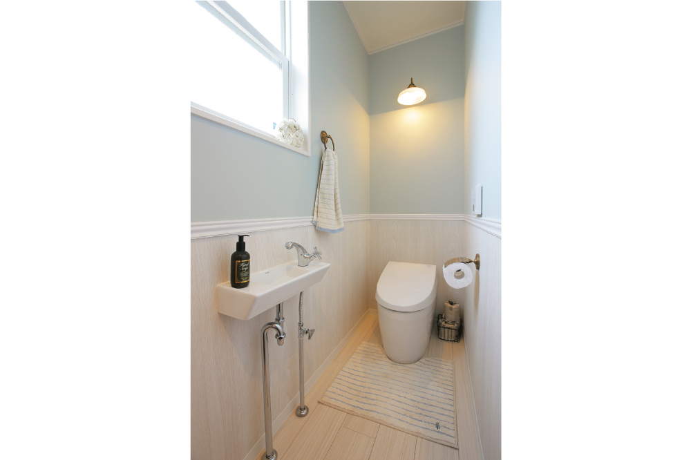 1階トイレもブルーを使った空間になっている。モールディングを使って壁を貼り分け味わいを出した。