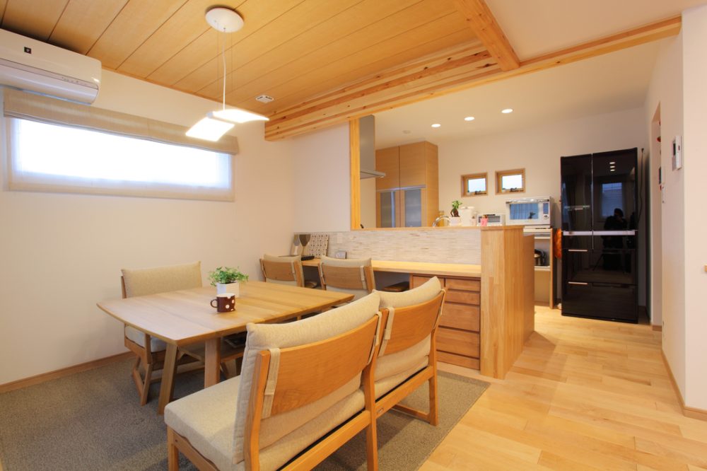 ダイニングの天井だけ木質系の天井材を貼りました。広いLDKの空間が引き締まります。