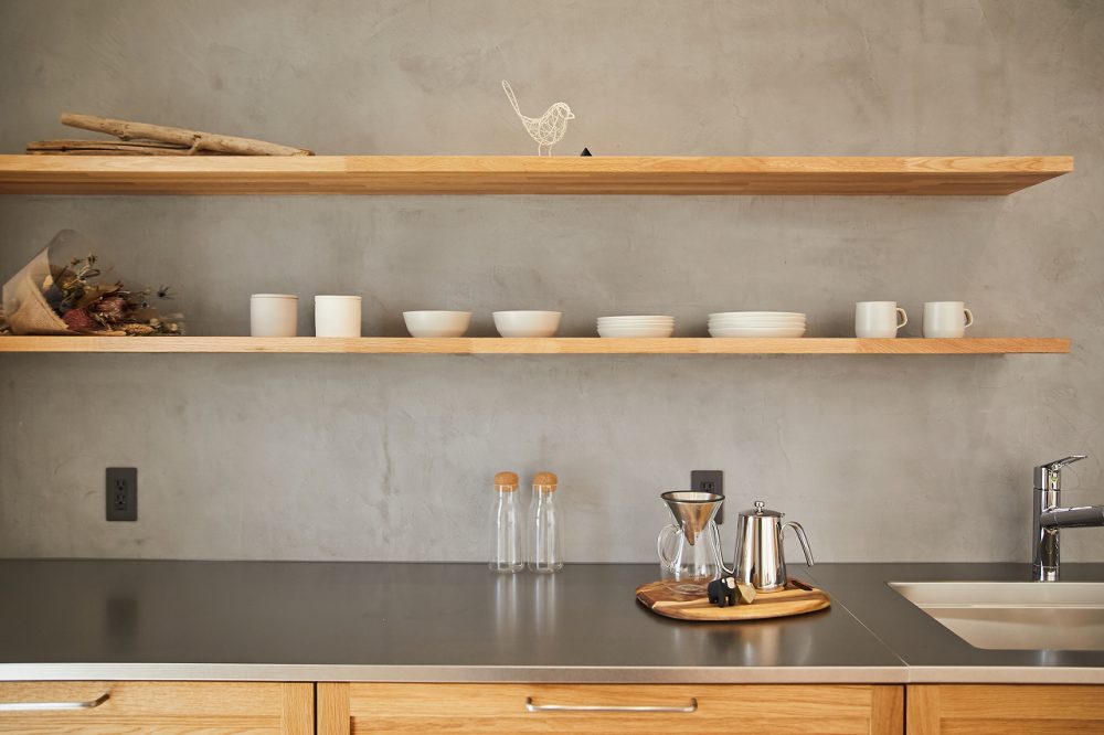 ステンレス製のワークトップやレンジフード、モールテックスで仕上げた壁の無機質さが、木の風合いをより際立たせています。 -
