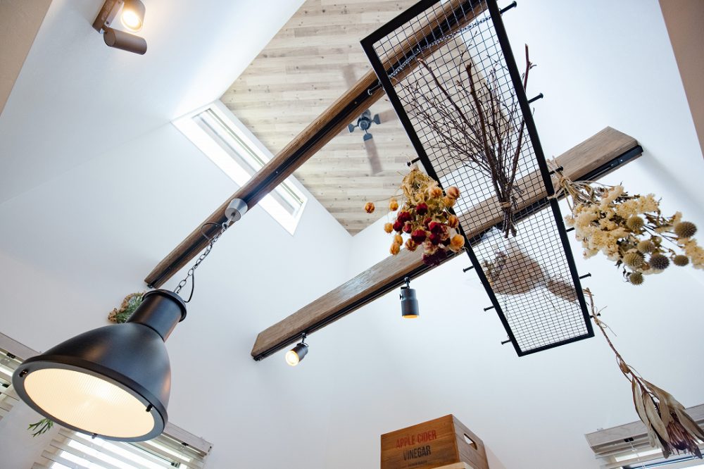 ダイニング上部に設けた、光をより取り込む吹抜け。2本の化粧梁は使い込んだ風合いを出すためにエイジング加工を施しています。