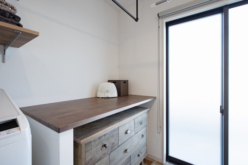 洗面脱衣室で完結できる洗濯動線。カウンターでは立ったままアイロンがけなどの作業を楽に行えます。掃き出し窓からはテラスに出られるので、室内外で物干しが可能です。