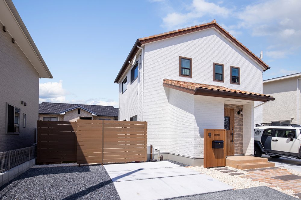切妻屋根に明るい色の瓦、レンガで可愛らしく仕上がったプロヴァンス風の外観。玄関の上に付けた小屋根が洋瓦をより印象的に見せてくれます。4つの窓は同じサイズの上げ下げ窓を採用。サッシ廻りに施したモールも相まって洋風感がぐっと引き立ちます。