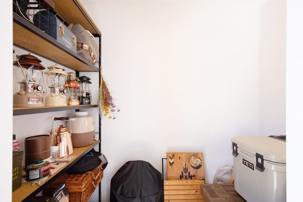 SICへの入り口には三角の下がり壁を設けました。収納には、ご趣味のアウトドアグッズがずらりと並びます。