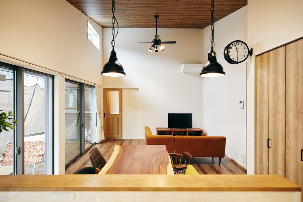 リビング・ダイニングの掃出し窓からはウッドデッキへと繋がり、アウトドアリビングとして活用されています。