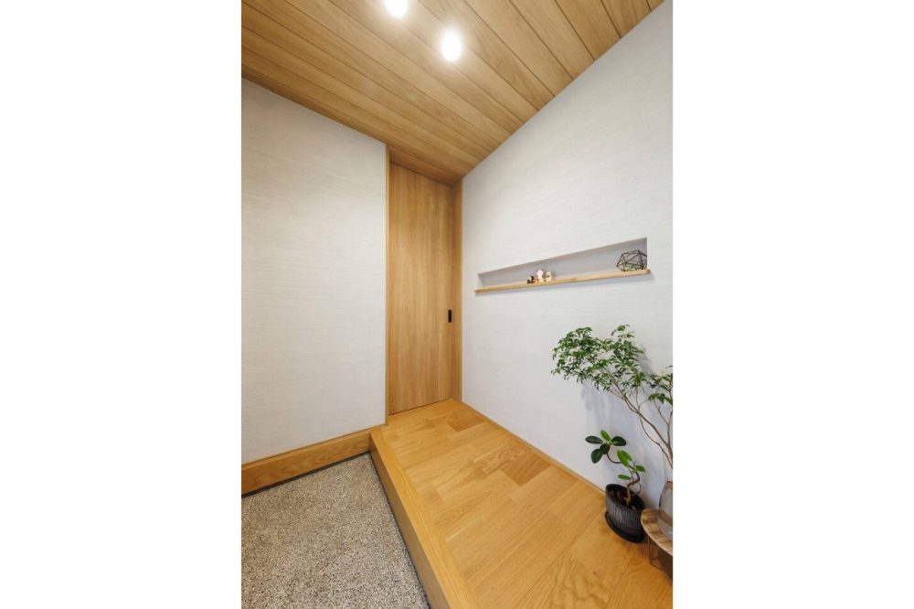 玄関ポーチからホールまで軒天を統一され、一体感のある仕上がりに。ホール正面のニッチにはインテリアとしてお気に入りの小物を飾られています。
