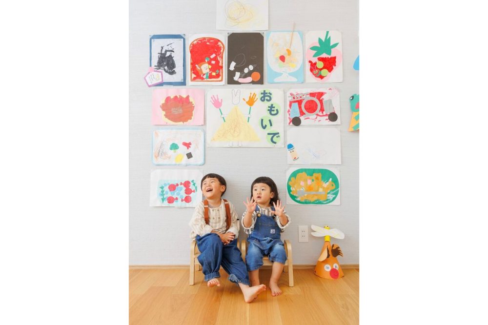 2階の子ども部屋は、現在使用頻度が少ない為、保育園でお子様達が描いた絵の展示スペースとして活用されています。せっかくなので今回そこで記念写真を撮影♪
