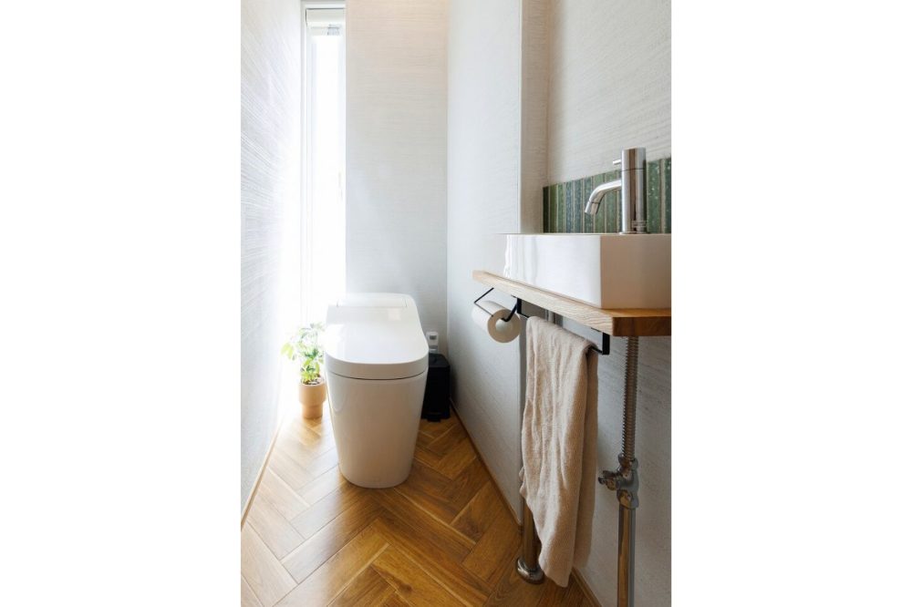 縦長の窓から、トイレにもたくさん光が入ります。トイレの後ろには薄壁を施工し、薄壁の奥には収納を隠して作られました。使い勝手とデザイン性両方を兼ね備えたトイレに。