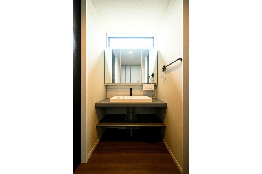 限られたスペースを有効活用した造作洗面台。洗面ボウル下のオープンなデザインは、圧迫感がなく空間を広く見せます。タイルをあしらった壁面や、インダストリアルな照明など、細部にまでこだわったデザインが、毎日の身支度を楽しくしてくれます。