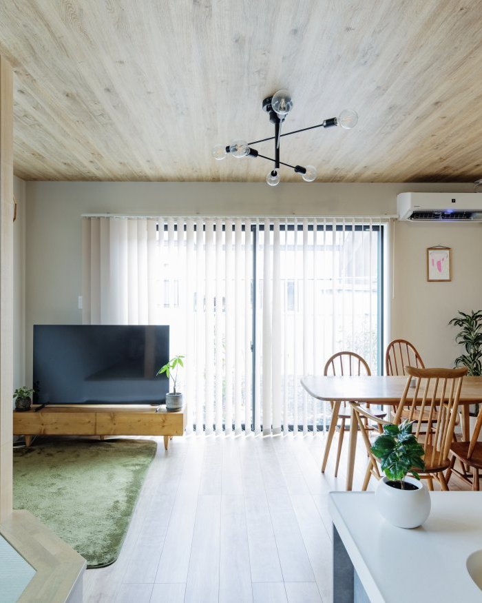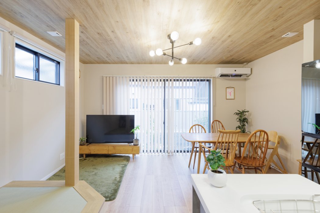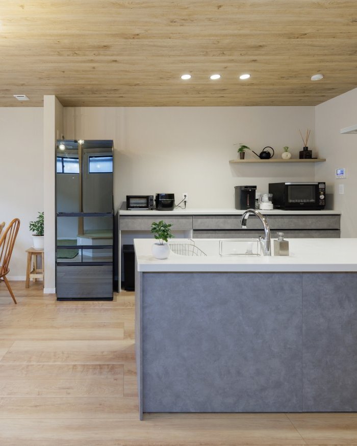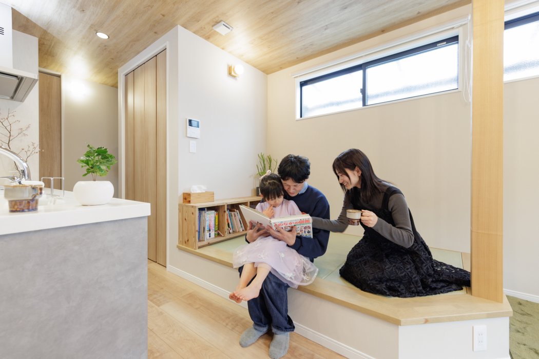家族が集まるLDKは木目調の天井とフローリングが空間全体に温かみをもたらし、グレーの対面型のキッチンと相性が良い空間に仕上がっています。リビングの一角には小上がりの畳スペースを設け、多目的に使えるくつろぎの空間をプラスしました。家族が集う中心となる、居心地の良い住まいです。