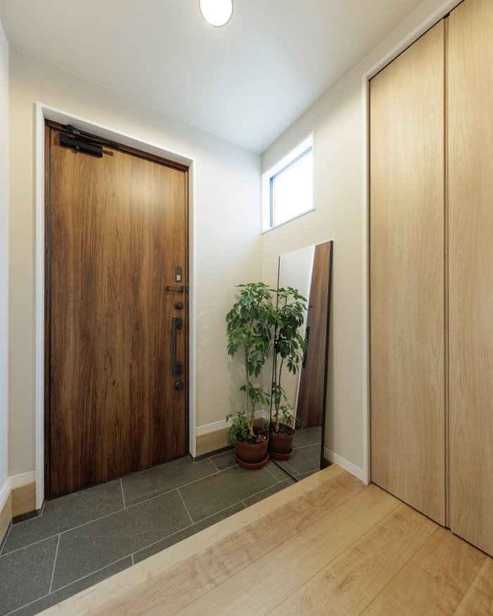 玄関に入ると、木の質感がやさしく迎えてくれる落ち着いた空間。
