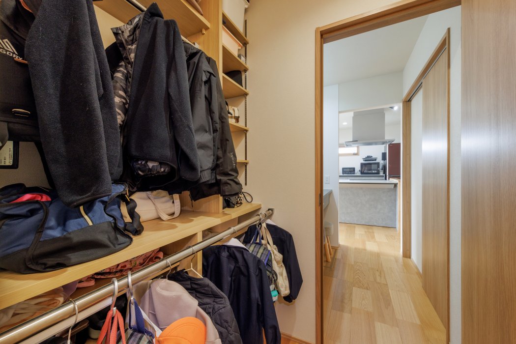 ご家族4人分の身支度をスムーズに行えるよう、家族用のロッカーを造作。上着やバッグを一括収納でき、朝の支度や帰宅後の片付けがスムーズになります。さらに、ロッカーからそのまま洗面→キッチンへと繋がる便利な動線を確保。無駄のない家事動線が、快適で効率的な暮らしを実現します。