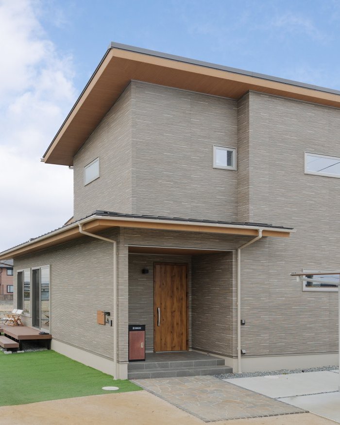 自然と調和する落ち着いた色合いの外観が特徴の住まい。シンプルでありながらも個性が光るフォルムが、洗練された印象を与えます。