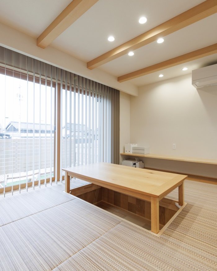 天井に化粧梁を採用し、木の温もりを感じられる心地よい空間に。畳の質感と梁のデザインが調和し、家族団欒の時間をより豊かに演出します。