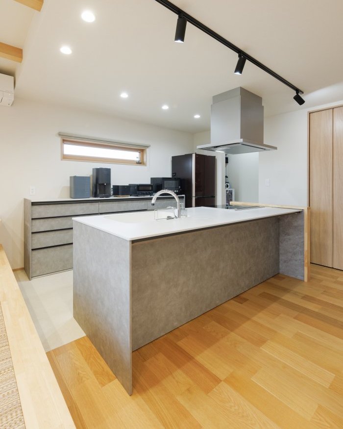 掘りごたつの並びにキッチンを配置し、料理や洗い物をしながらでも家族の気配をいつでも感じられる配置に。実はご主人様がキッチンに立たれる事が多いというS様。キッチンと畳コーナーにはこだわりが詰まっています。