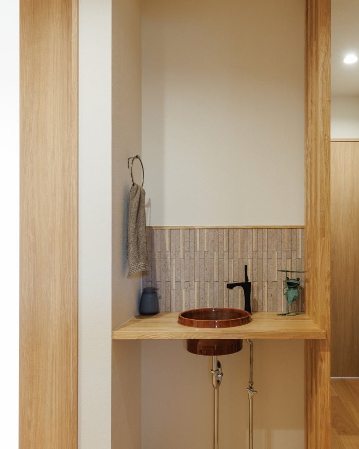 玄関から帰ってすぐ手を洗えるように、こだわりの造作手洗いを設置。木の温もりを感じるデザインと、美しいボウルが空間に調和し、使いやすさとデザイン性を兼ね備えた仕上がりに。