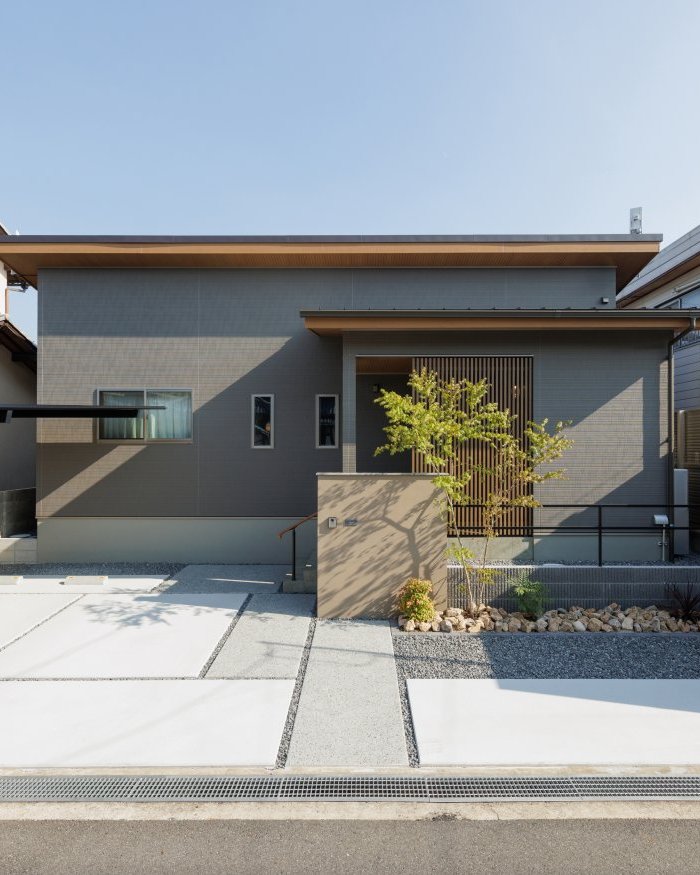 平屋21坪の「終の棲家」として建てられたお住まい。落ち着きのある和の趣を感じさせる外観に、こだわりの格子や門柱が調和し、品のある佇まいを演出しています。駐車スペースは3台分のゆとりがあり、ご家族や来客時も安心です。