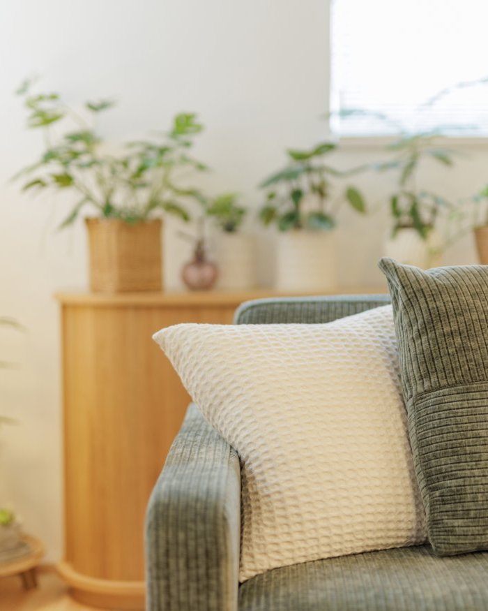 この住まいの大きな特徴は、家族の身体に優しい素材へのこだわりです。玄関・LDK・主寝室の天井と壁には漆喰を採用。自然素材ならではの柔らかな質感に加え、調湿や消臭などの効果もあり、心地よく健康的に過ごせます。無垢の床材は床暖房対応で、冬でも足元からじんわりと温まり、家族みんながほっとできる空間です。