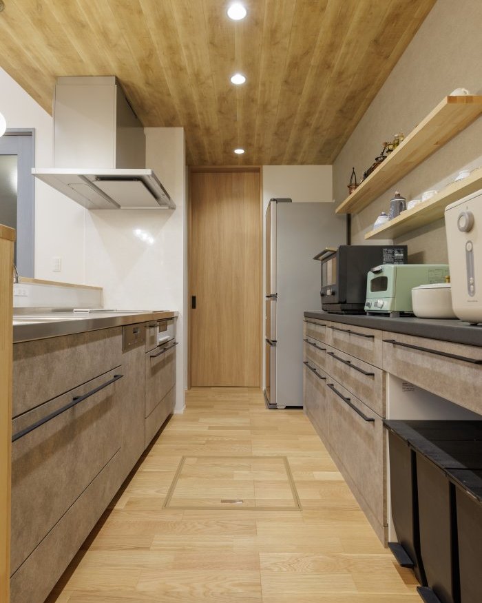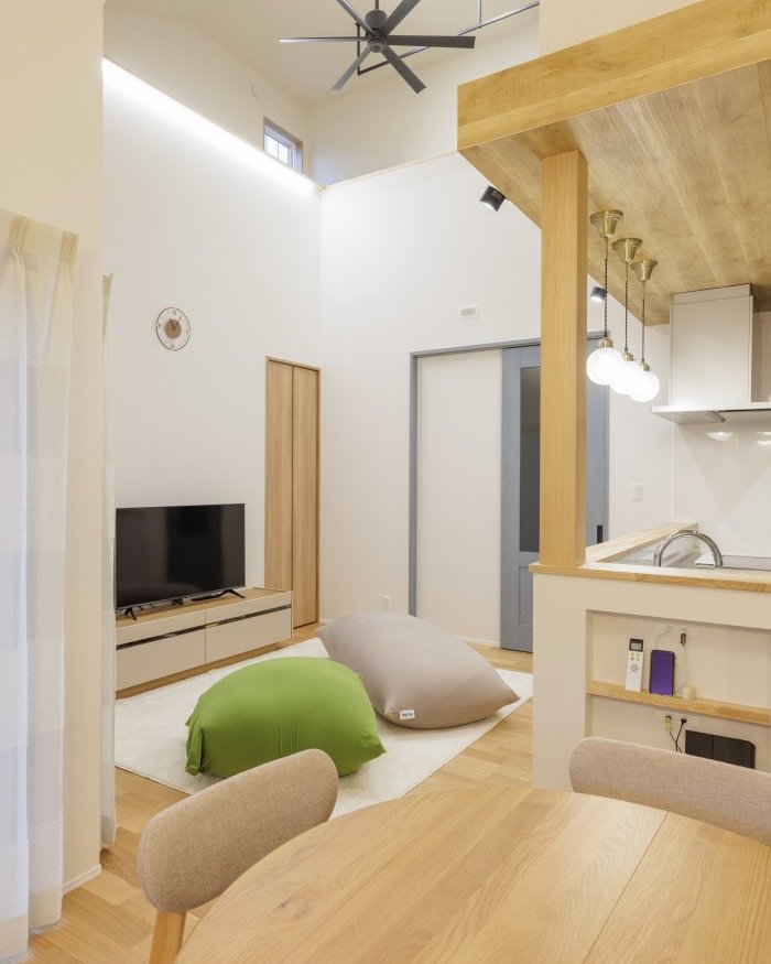 ダイニング・リビングの上はお部屋を作られず吹き抜けを採用され、開放的な空間に。キッチンの天井は吹き抜け部分に天井のはね出しを採用され、クロスの貼り分けを行う事でデザイン性が向上します。