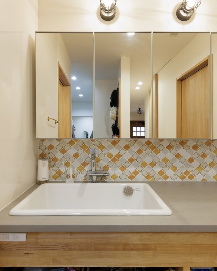 一番こだわった箇所が造作洗面台。名古屋モザイクのコラベルタイル(NLA-MIX)を採用し、デザイン性と収納力を両立した洗面台に。奥様の理想通りの空間に仕上がりました。