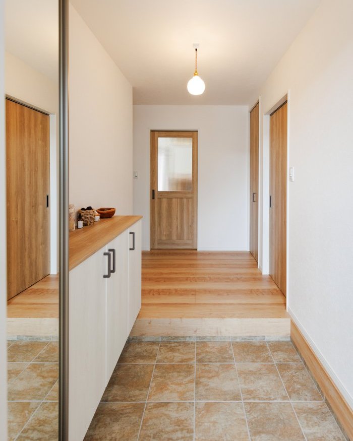 4帖の玄関スペースにはトールタイプとキャビネットタイプを組み合わせた玄関収納を採用。収納量も保ちつつ、小物などを飾り玄関先を自分好みにディスプレイ出来ます。