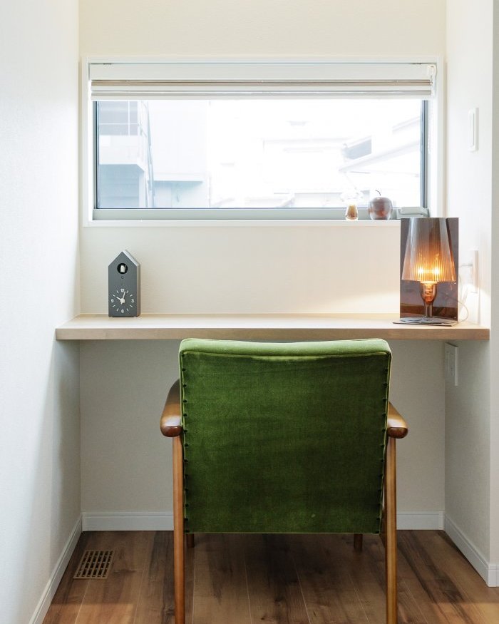 家を建てるなら造作洗面にしたいというご希望を持たれていたお施主様。洗面台でメイクも出来るようにしたいという事から、横に広いカウンターを採用し、鏡を取付しました。コラベルタイルを貼り、大人可愛い洗面台に。