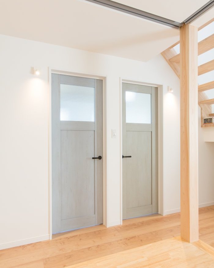 今はひと部屋の子ども部屋。将来は仕切ってふた部屋にされるそう。家づくりをした思い出になってほしいというご夫婦の思いから、扉の色はお子さまそれぞれに選んでもらいました。