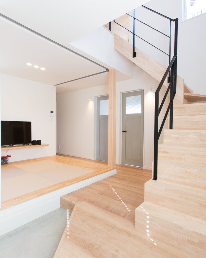 玄関横の畳コーナー。お子さまがお友達とゲームをするときによく使われているそう。学校の家庭訪問の際には、リビングがある2階までお通ししなくても腰かけてゆっくりお話しできるので便利、と奥さま。細長い縦すべり出し窓はフロストガラス。圧迫感なく、外からの視線をかわせます。
