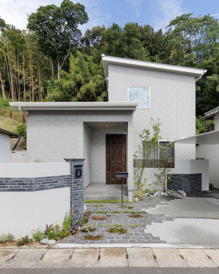リビングの目隠しになる壁は『TOYO/シャンテボーダ―』のタイルで装飾。シンボルツリーのジューンベリーがやがては2階の窓から見えるようにと窓のサイズや位置、1階屋根の勾配までバランスを調整しました。