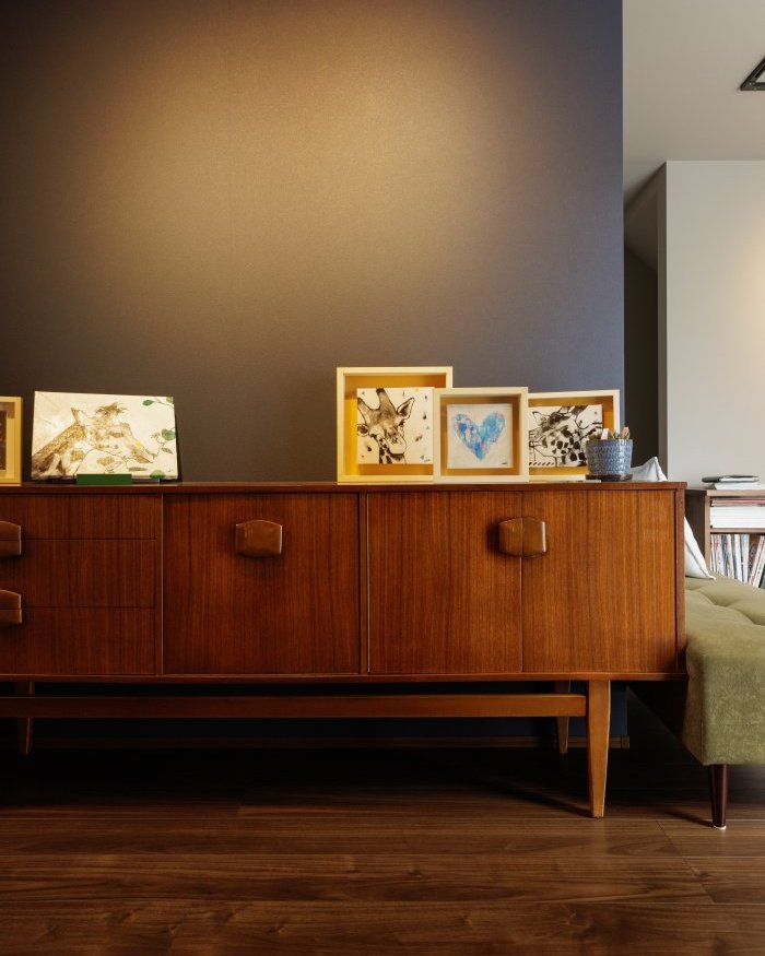 玄関正面にもお気に入りの絵を飾っています。キャビネットには靴を収納。