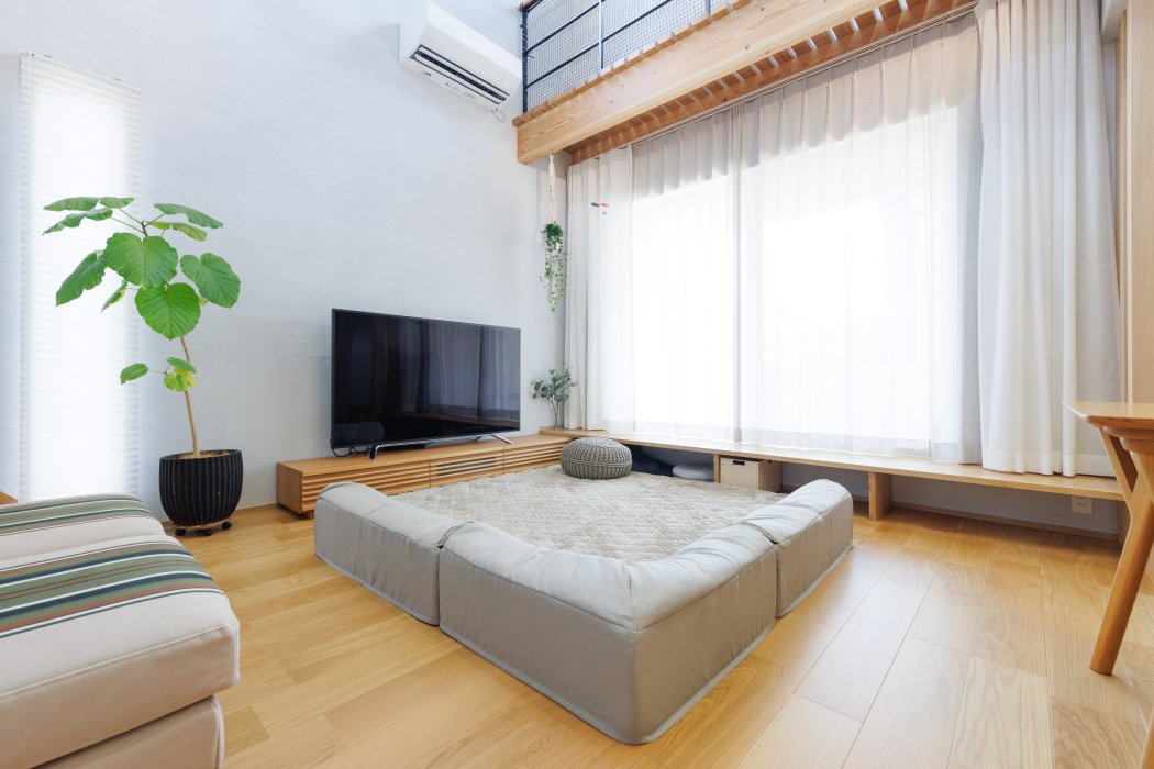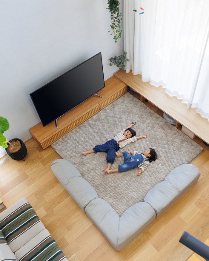 吹き抜けからもお子さまの様子が見られて安心です。お子さまが小さいうちは、フロアソファを採用されてお昼寝や遊び場としても活用されています。のびのびと気持ち良さそうに過ごす素敵な写真が撮れました!
