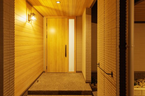 自然や趣ある物をがお好きな奥さまの選択で玄関ポーチは洗い出し仕上げを採用。こちらにはベンチを置いてメダカを飼われるご予定です。