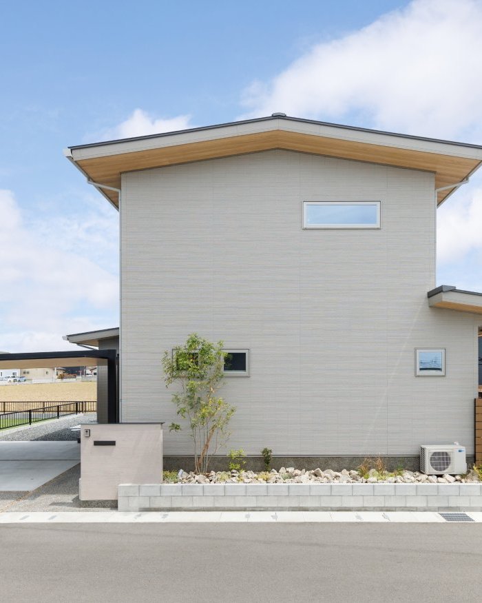 ご夫婦とお子さま2人の4人家族のお施主様、外で子ども達を遊ばせてあげたいというお気持ちが強く、一戸建てを建築されました。西側のファサードは屋根の勾配を緩く設定し、優しい印象を与える外観に。
