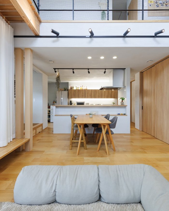 吹き抜けからやわらかな光が降り注ぐ、開放感あふれるLDK。キッチン・ダイニング・リビングが緩やかにつながり、家族それぞれが思い思いの時間を過ごしながらも、自然と気配を感じられる間取りに。