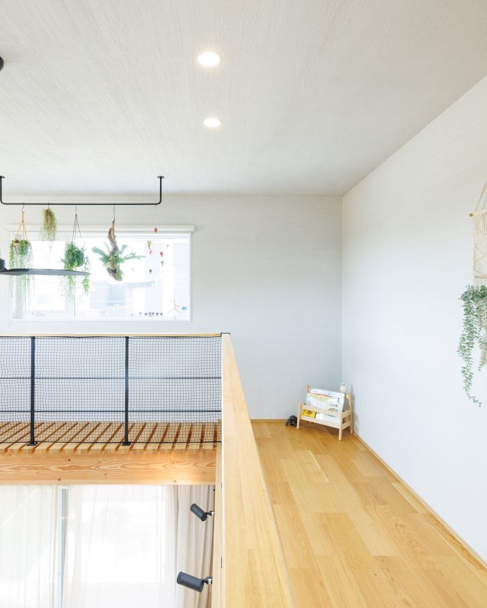 日当たりの良い吹き抜けには遊び心ある「キャットウォーク」を造作。手摺は布団干しも兼ねています。敢えてベランダはつくらず、外の花粉や埃を気にする事無く布団を干す事ができます◎