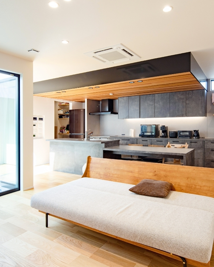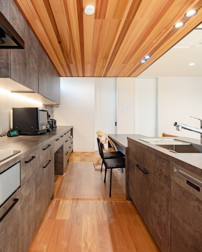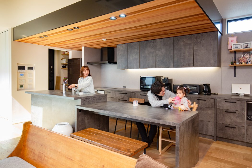キッチンの天井を窓の高さまで下げ、レッドシダーの羽目板張りを施すことで空間に立体感が生まれました。奥さまがInstagramで見つけたアイデアをもとにご提案させていただきました。キッチンはGRAFTEKTを採用。シンク側にダイニングテーブルを配置することで、配膳・片付けがスムーズに。
