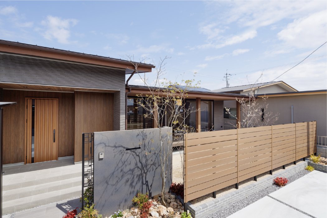 「和モダンな外観にしたい」というお施主様のご要望から、軒を横に80cm、前方に87cmと長めに出し、和の風格が感じられる外観に仕上がりました。屋根は1.5寸の緩勾配にされ、シンプルで落ち着いた印象に。
