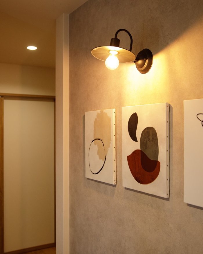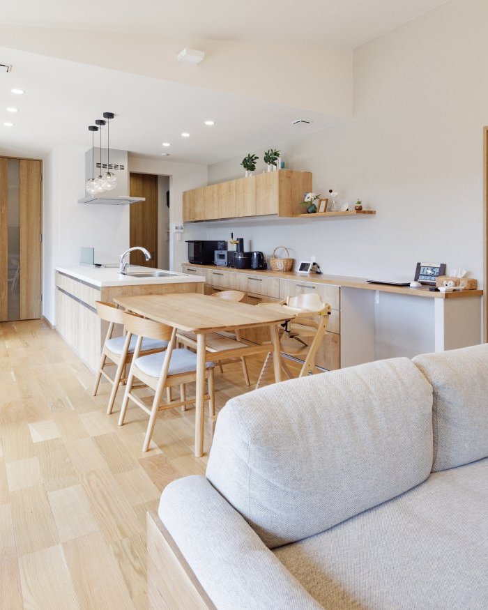 床材は【ウッドワン コンビットワンダー152 オーク】。木目の美しさと高級感、足ざわりの良さが特長です。LDKの北側は、ご主人のご要望によりグレーのクロスを貼り分けています。柔らかなグレーと優しいオーク材とが調和しています。